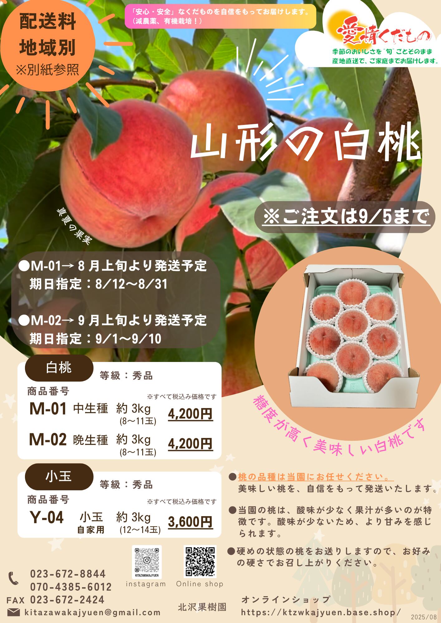 白桃の生育不良によりM-01に関しまして8/24以降の発送を予定しています。